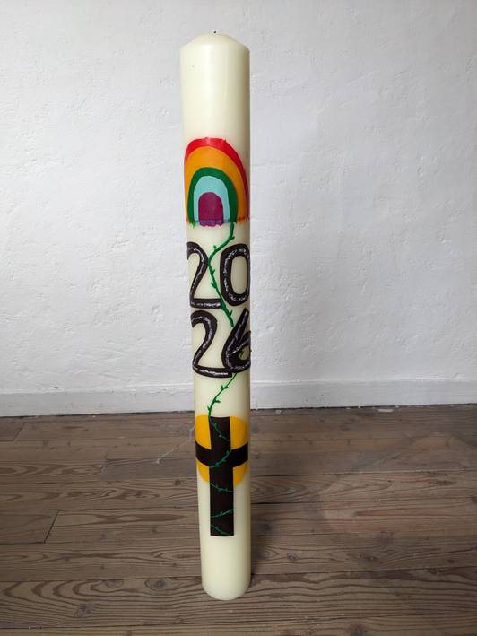 Auch die Konfi-Teamer wurden kreativ und gestalteten die diesjährige Osterkerze für Muggensturm. Vielen Dank an die Konfi-Teamer Elias, Leni, Lukas und Rebecca für die schöne Osterkerze und eure Unterstützung beim Konfi-Samstag!